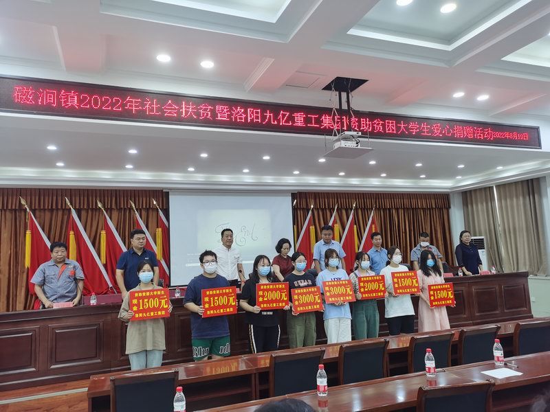 愛是與生俱來的,在血液里流動,在骨子里結晶,它源源不斷的由心而生,永不枯竭,只要人人都愿意奉獻一點愛,就如甘霖沐浴大地,人間處處盛開幸福之花!   為響應洛陽市政府精準扶貧政策,洛陽九億重工集團有限公司及董事長王九茂積極參與捐資助學的慈善義舉活動,特做出如下決定:1、公司幫扶磁澗鎮2017年新招貧困大學生21名順利入學,每人資助2000元,總計肆萬貳仟元整;   2、總經理王九茂(縣政協委員)以個人名義資助磁澗鎮南窯村2017年新招大學生6名,總計12000元整;   我相信,在社會各界的大力支持和共同努力下,我們的“愛心助學”活動將會惠及到更多的同學,為了夢想,刻苦讀書、報銷祖國,廣大同學也一定會在溫暖的社會大家庭里茁壯成長,必將成為國家建設的有用之才!   洛陽九億重工集團有限公司   董事長:王九茂